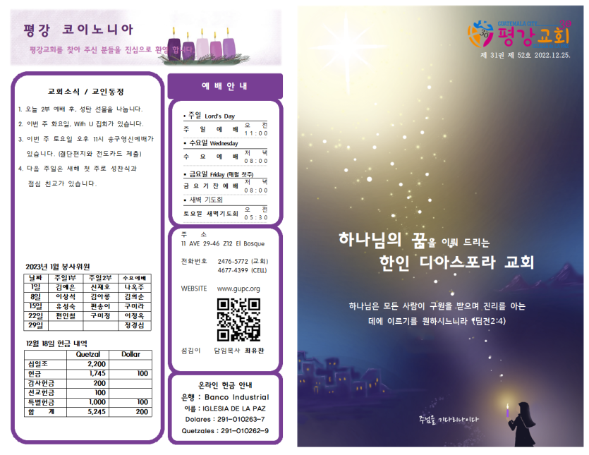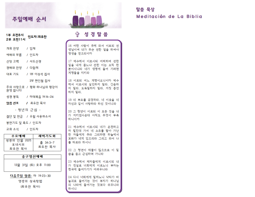 2022년 12월 25일 주일예배 주보 페이지 정보 작성자 과테말라평강교회 댓글 0건 조회 1,668회 작성일 22-12-27 18:33 목록 본문 2022년 12월 25일 주일예배 주보 이전글2023년 1월 1일 주일예배 주보 23.01.01 다음글2022년 12월 18일 주일예배 주보 22.12.18 댓글 0 댓글목록 등록된 댓글이 없습니다.