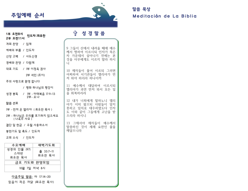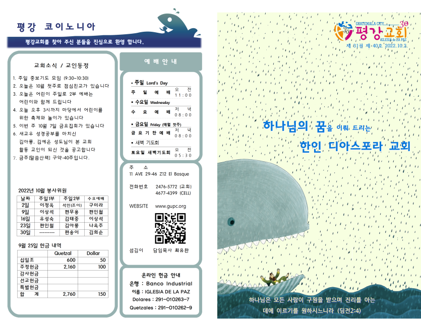 2022년 10월 2일 주일예배 주보 페이지 정보 작성자 과테말라평강교회 댓글 0건 조회 1,723회 작성일 22-10-01 16:34 목록 본문 2022년 10월 2일 주일예배 주보 이전글2022년 10월 9일 주일예배 주보 22.10.08 다음글2022년 9월 25일 주일예배 주보 22.09.24 댓글 0 댓글목록 등록된 댓글이 없습니다.