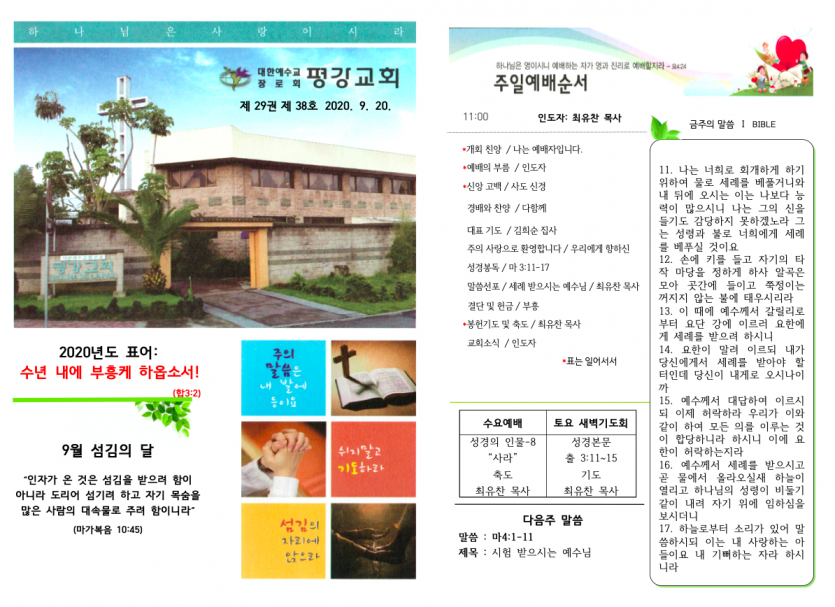 2020/09/20 과테말라 평강교회 주보 페이지 정보 작성자 과테말라평강교회 댓글 0건 조회 2,347회 작성일 20-10-05 23:53 목록 본문 2020/09/20 과테말라 평강교회 주보 이전글2020/09/27 과테말라 평강교회 주보 20.10.05 다음글2020/09/13 과테말라 평강교회 주보 20.10.05 댓글 0 댓글목록 등록된 댓글이 없습니다.