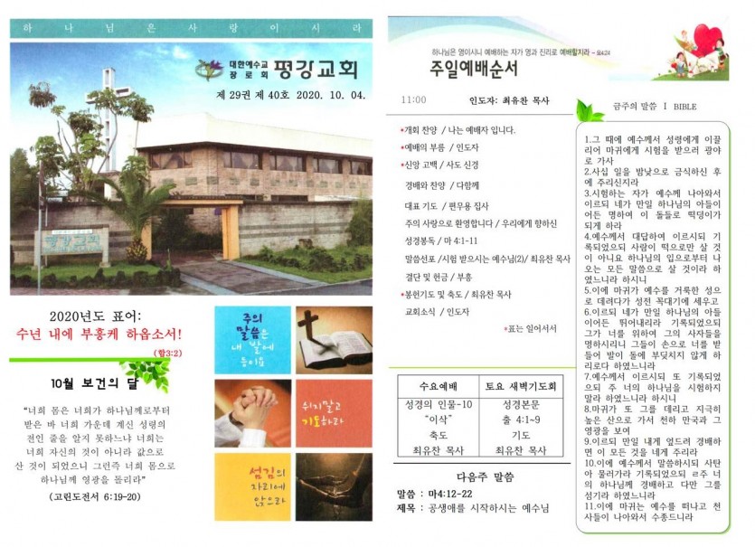 10월 4일, 주보 페이지 정보 작성자 과테말라평강교회 댓글 0건 조회 2,328회 작성일 20-11-22 06:45 목록 본문 10월 4일 주보 이전글10월 11일, 주보 20.11.22 다음글2020/09/27 과테말라 평강교회 주보 20.10.05 댓글 0 댓글목록 등록된 댓글이 없습니다.