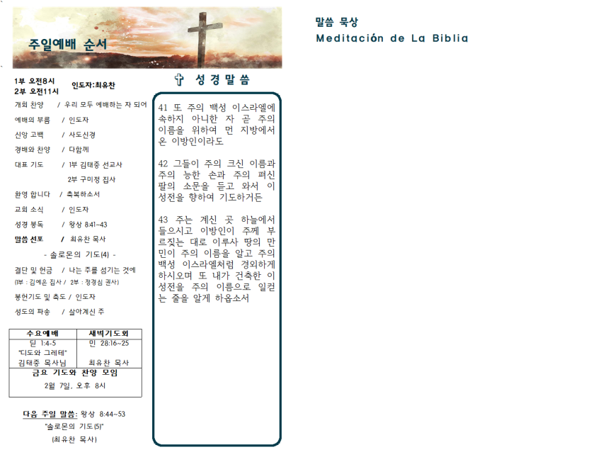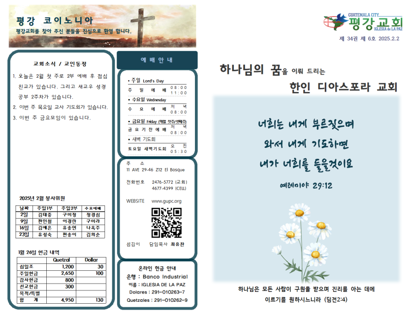 2025년 2월 2일 주일예배 주보 페이지 정보 작성자 과테말라평강교회 댓글 0건 조회 640회 작성일 25-02-01 15:20 목록 본문 2025년 2월 2일 주일예배 주보 이전글2025년 2월 9일 주일예배 주보 25.02.07 다음글2025년 1월 26일 주일예배 주보 25.01.24 댓글 0 댓글목록 등록된 댓글이 없습니다.