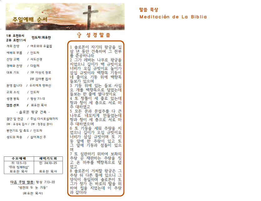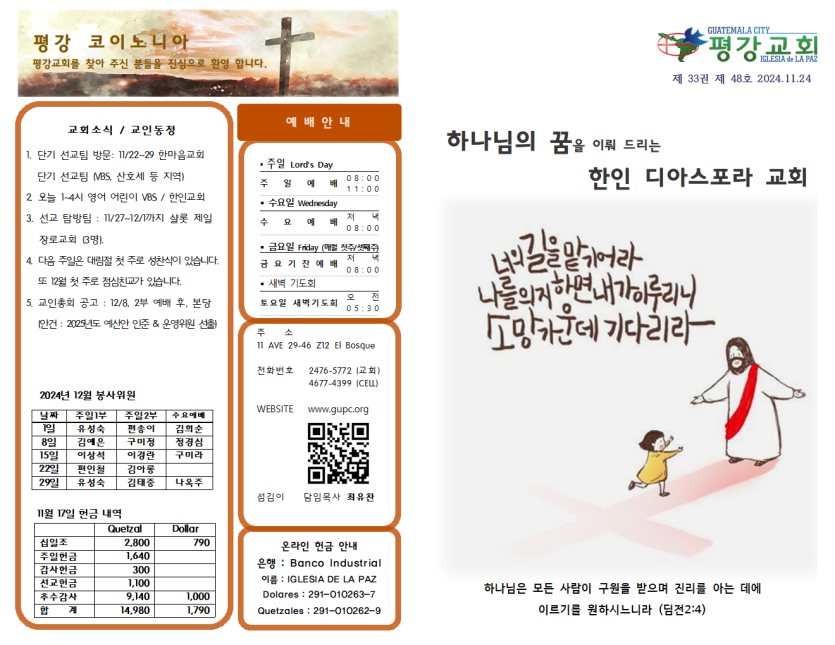 2024년 11월 24일 주일예배 주보 페이지 정보 작성자 과테말라평강교회 댓글 0건 조회 783회 작성일 24-11-24 06:46 목록 본문 2024년 11월 24일 주일예배 주보 이전글2024년 12월 1일 주일예배 주보 24.11.30 다음글2024년 11월 17일 주일예배 주보 24.11.16 댓글 0 댓글목록 등록된 댓글이 없습니다.