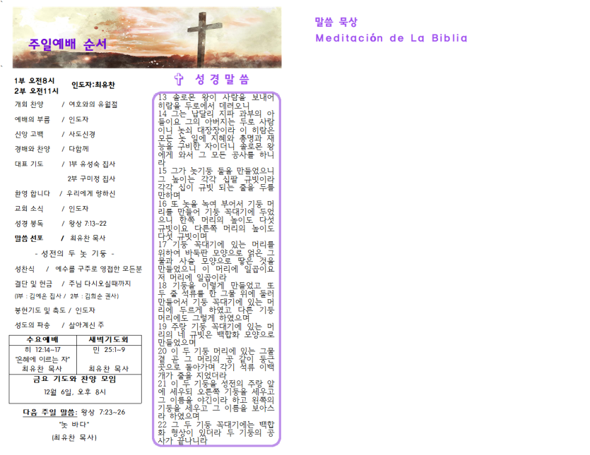2024년 12월 1일 주일예배 주보 페이지 정보 작성자 과테말라평강교회 댓글 0건 조회 781회 작성일 24-11-30 08:27 목록 본문 2024년 12월 1일 주일예배 주보 이전글2024년 12월 8일 주일예배 주보 24.12.08 다음글2024년 11월 24일 주일예배 주보 24.11.24 댓글 0 댓글목록 등록된 댓글이 없습니다.