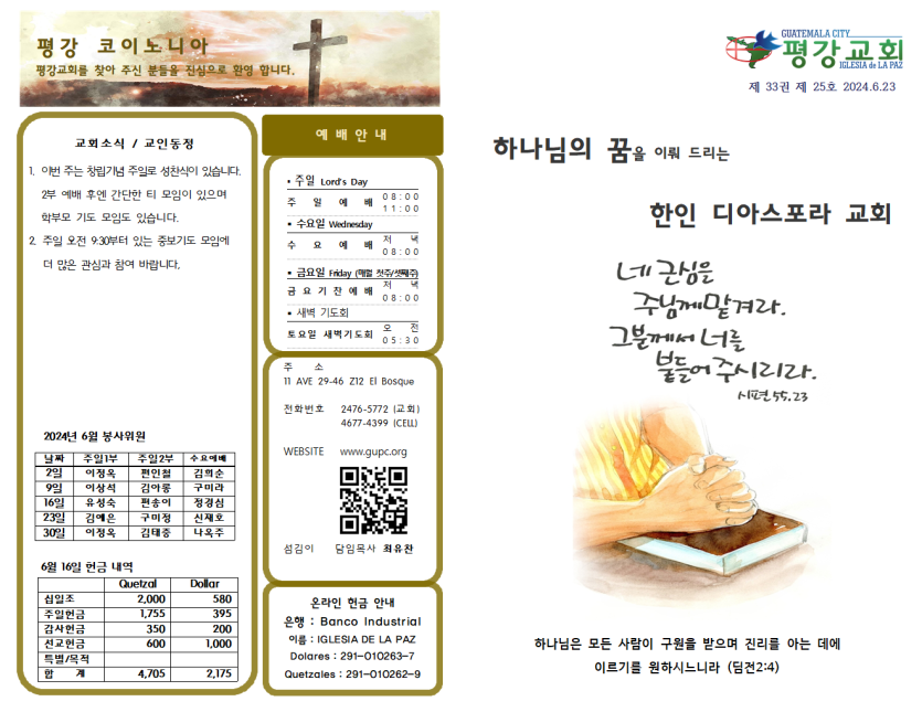 2024년 6월 23일 주일예배 주보 페이지 정보 작성자 과테말라평강교회 댓글 0건 조회 936회 작성일 24-06-22 17:39 목록 본문 2024년 6월 23일 주일예배 주보 이전글2024년 6월 30일 주일예배 주보 24.06.29 다음글2024년 6월 16일 주일예배 주보 24.06.15 댓글 0 댓글목록 등록된 댓글이 없습니다.