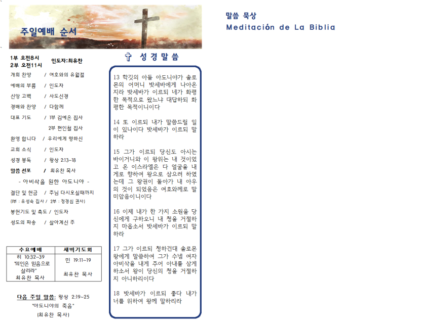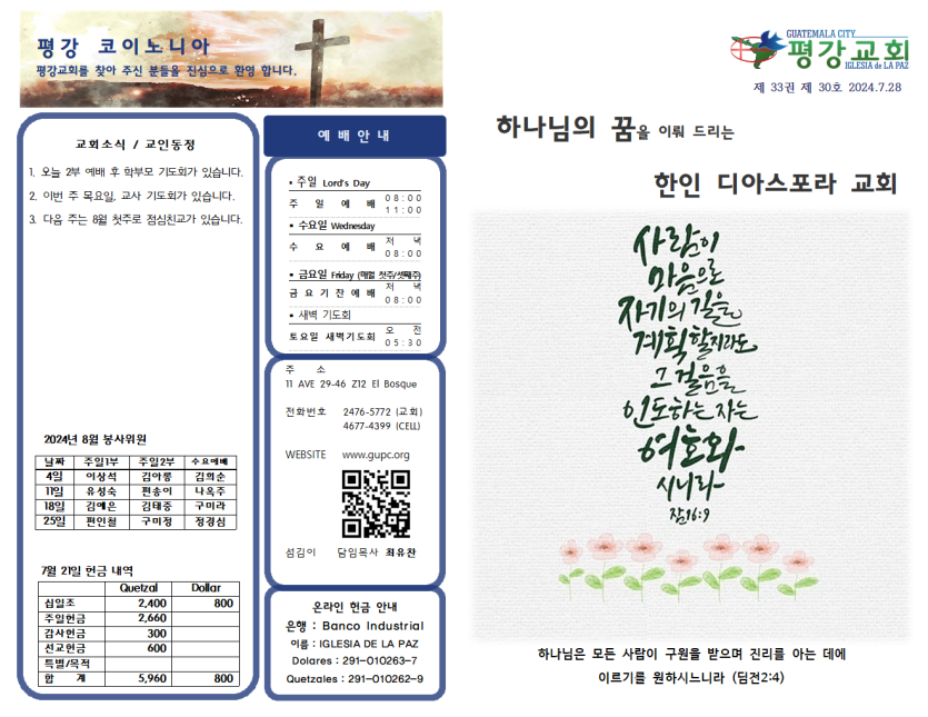 2024년 7월 28일 주일예배 주보 페이지 정보 작성자 과테말라평강교회 댓글 0건 조회 929회 작성일 24-07-27 17:39 목록 본문 2024년 7월 28일 주일예배 주보 이전글2024년 8월 4일 주일예배 주보 24.08.03 다음글2024년 7월 21일 주일예배 주보 24.07.20 댓글 0 댓글목록 등록된 댓글이 없습니다.