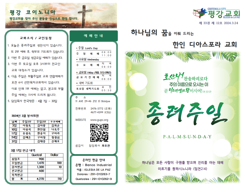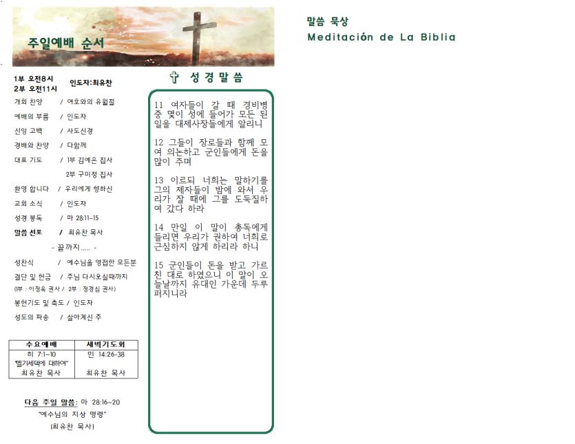 2024년 3월 24일 주일예배 주보 페이지 정보 작성자 과테말라평강교회 댓글 0건 조회 1,053회 작성일 24-03-23 17:39 목록 본문 2024년 3월 24일 주일예배 주보 이전글2024년 3월 31일 주일예배 주보 24.03.30 다음글2024년 3월 17일 주일예배 주보 24.03.16 댓글 0 댓글목록 등록된 댓글이 없습니다.