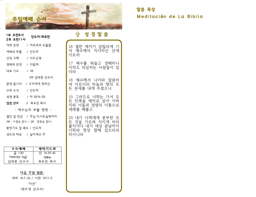 2024년 3월 31일 주일예배 주보 페이지 정보 작성자 과테말라평강교회 댓글 0건 조회 1,077회 작성일 24-03-30 14:56 목록 본문 2024년 3월 31일 주일예배 주보 이전글2024년 4월 7일 주일예배 주보 24.04.06 다음글2024년 3월 24일 주일예배 주보 24.03.23 댓글 0 댓글목록 등록된 댓글이 없습니다.