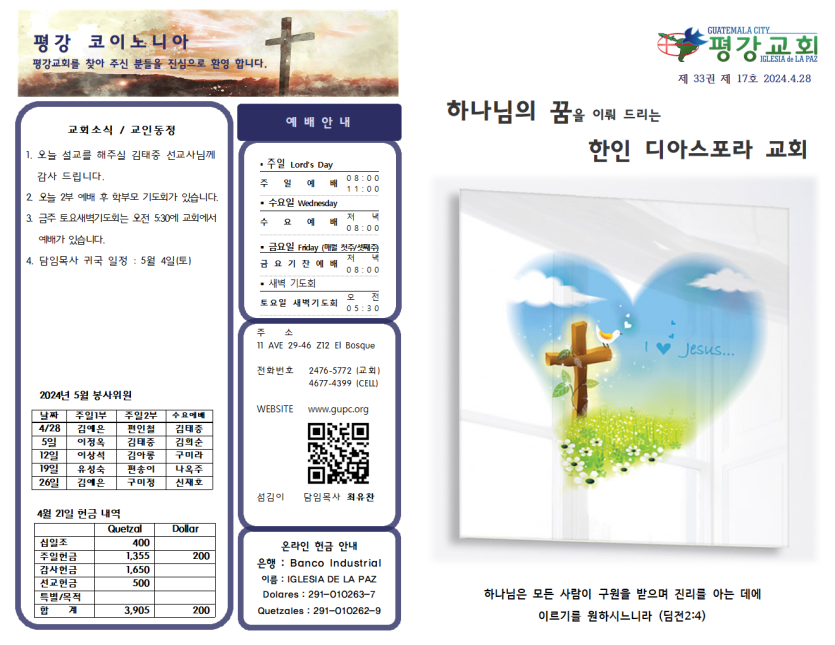 2024년 4월 28일 주일예배 주보 페이지 정보 작성자 과테말라평강교회 댓글 0건 조회 1,049회 작성일 24-04-27 16:09 목록 본문 2024년 4월 28일 주일예배 주보 이전글2024년 5월 5일 주일예배 주보 24.05.04 다음글2024년 4월 21일 주일예배 주보 24.04.20 댓글 0 댓글목록 등록된 댓글이 없습니다.