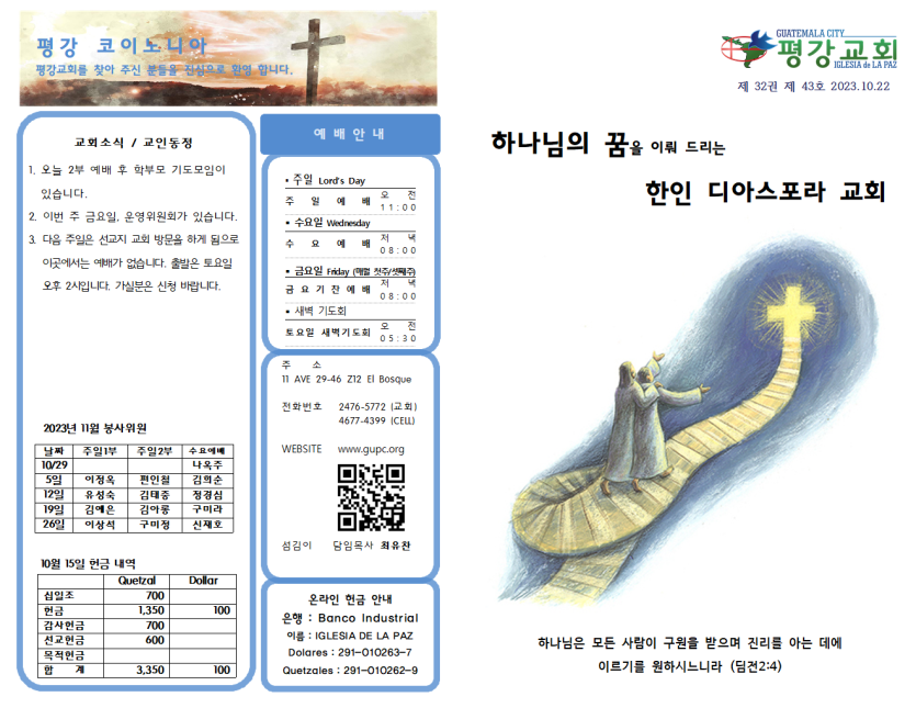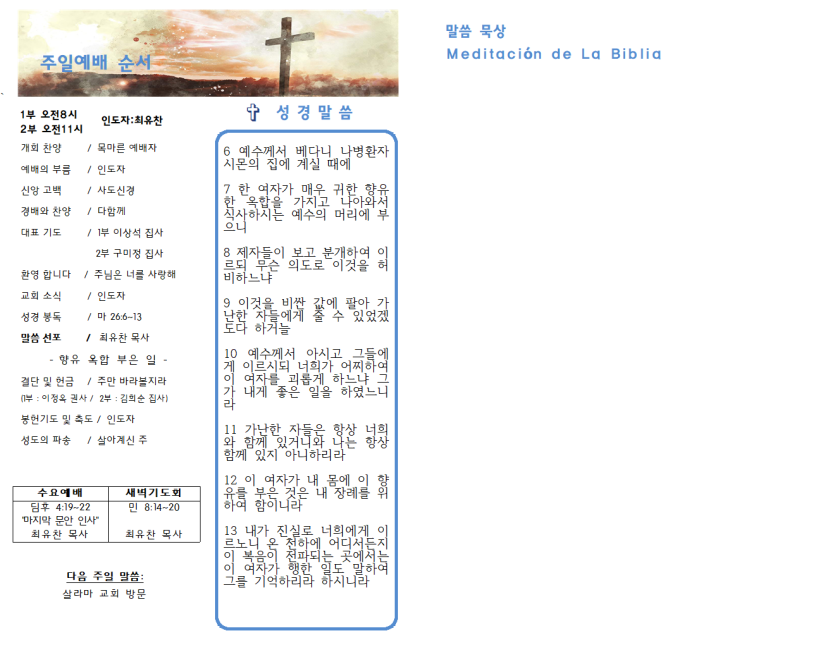 2023년 10월 22일 주일예배 주보 페이지 정보 작성자 과테말라평강교회 댓글 0건 조회 1,192회 작성일 23-10-21 14:49 목록 본문 2023년 10월 22일 주일예배 주보 이전글2023년 11월 5일 주일예배 주보 23.11.04 다음글2023년 10월 15일 주일예배 주보 23.10.14 댓글 0 댓글목록 등록된 댓글이 없습니다.