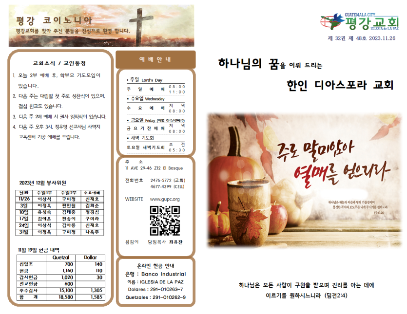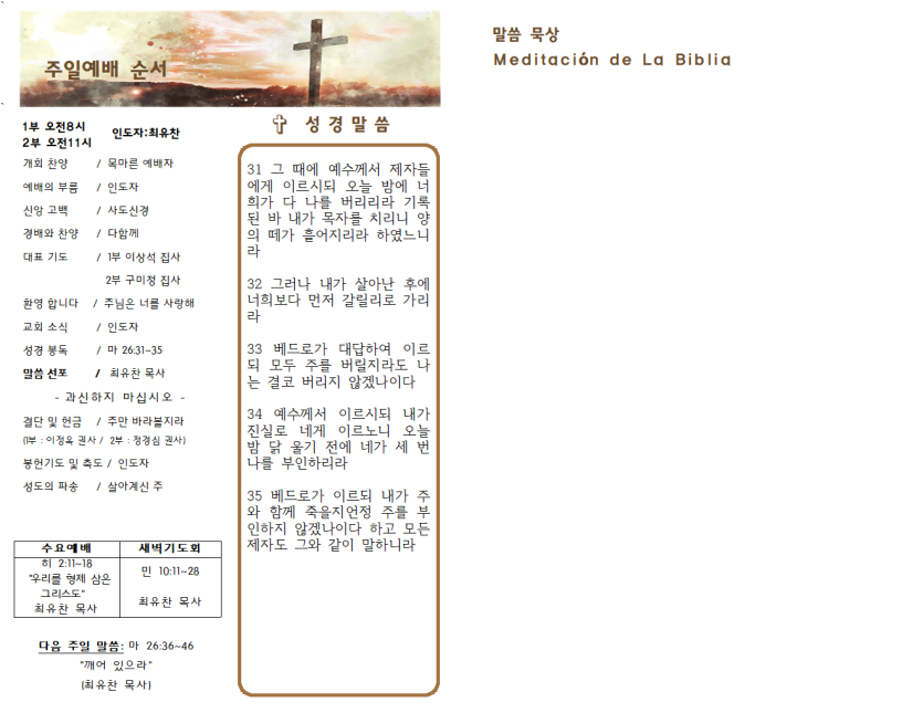 2023년 11월 26일 주일예배 주보 페이지 정보 작성자 과테말라평강교회 댓글 0건 조회 1,121회 작성일 23-11-25 17:32 목록 본문 2023년 11월 26일 주일예배 주보 이전글2023년 12월 3일 주일예배 주보 23.12.02 다음글2023년 11월 19일 주일예배 주보 23.11.18 댓글 0 댓글목록 등록된 댓글이 없습니다.