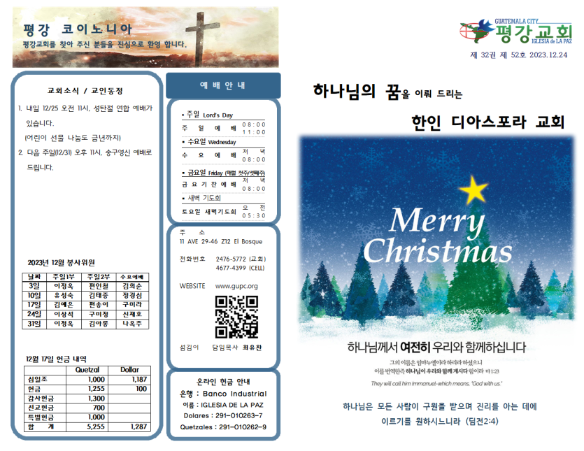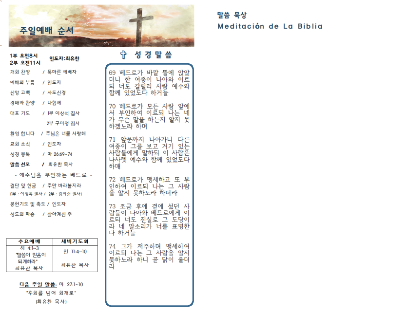 2023년 12월 24일 주일예배 주보 페이지 정보 작성자 과테말라평강교회 댓글 0건 조회 1,161회 작성일 23-12-23 08:48 목록 본문 2023년 12월 24일 주일예배 주보 이전글2023년 12월 31일 주일예배 주보 23.12.30 다음글2023년 12월 17일 주일예배 주보 23.12.16 댓글 0 댓글목록 등록된 댓글이 없습니다.
