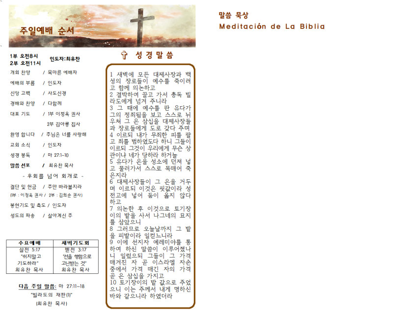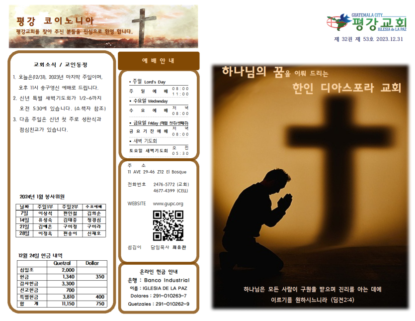 2023년 12월 31일 주일예배 주보 페이지 정보 작성자 과테말라평강교회 댓글 0건 조회 1,184회 작성일 23-12-30 09:53 목록 본문 2023년 12월 31일 주일예배 주보 이전글2024년 1월 7일 주일예배 주보 24.01.06 다음글2023년 12월 24일 주일예배 주보 23.12.23 댓글 0 댓글목록 등록된 댓글이 없습니다.