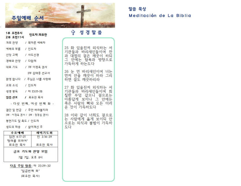 2023년 7월 2일 주일예배 주보 페이지 정보 작성자 과테말라평강교회 댓글 0건 조회 1,345회 작성일 23-07-01 15:28 목록 본문 2023년 7월 2일 주일예배 주보 이전글2023년 7월 9일 주일예배 주보 23.07.08 다음글2023년 6월 25일 주일예배 주보 23.06.24 댓글 0 댓글목록 등록된 댓글이 없습니다.
