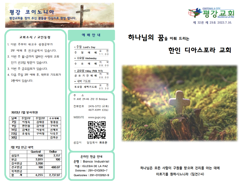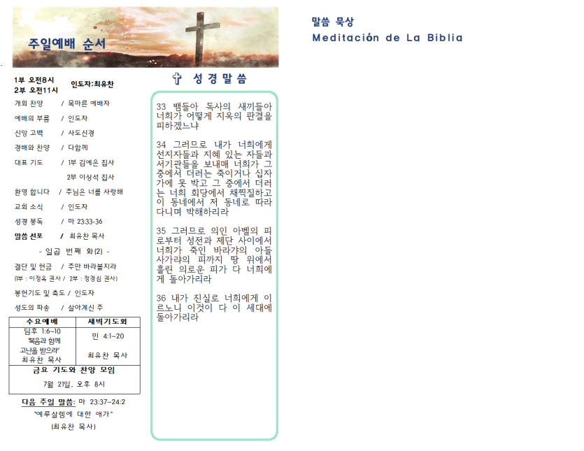 2023년 7월 16일 주일예배 주보 페이지 정보 작성자 과테말라평강교회 댓글 0건 조회 1,388회 작성일 23-07-15 08:50 목록 본문 2023년 7월 16일 주일예배 주보 이전글2023년 8월 6일 주일예배 주보 23.08.05 다음글2023년 7월 9일 주일예배 주보 23.07.08 댓글 0 댓글목록 등록된 댓글이 없습니다.