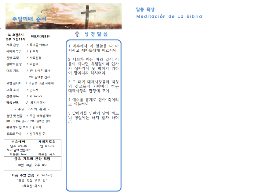 2023년 10월 15일 주일예배 주보 페이지 정보 작성자 과테말라평강교회 댓글 0건 조회 1,194회 작성일 23-10-14 14:31 목록 본문 2023년 10월 15일 주일예배 주보 이전글2023년 10월 22일 주일예배 주보 23.10.21 다음글2023년 10월 8일 주일예배 주보 23.10.07 댓글 0 댓글목록 등록된 댓글이 없습니다.
